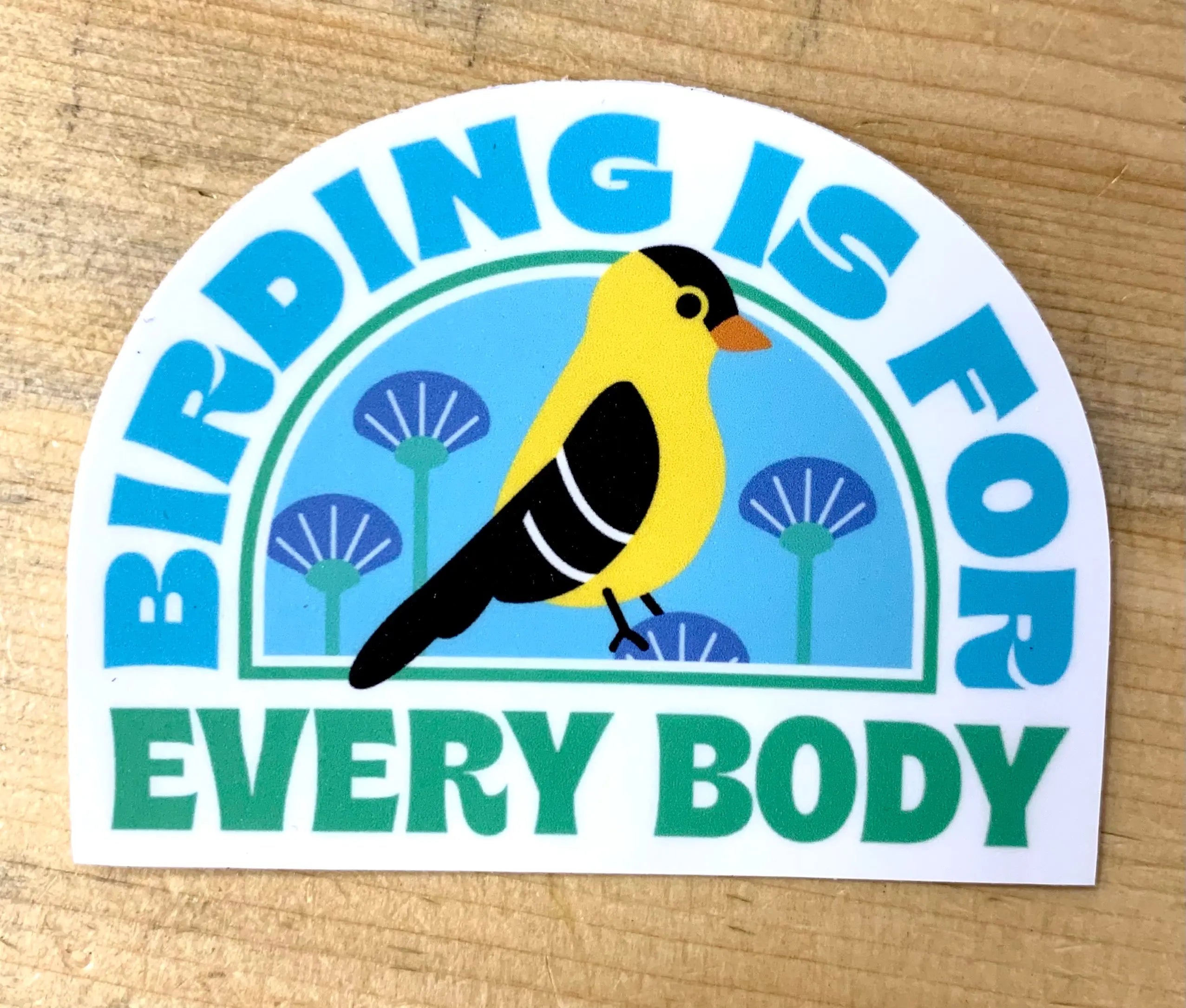 Birding is for Every Body vinyl sticker featuring an American Goldfinch.