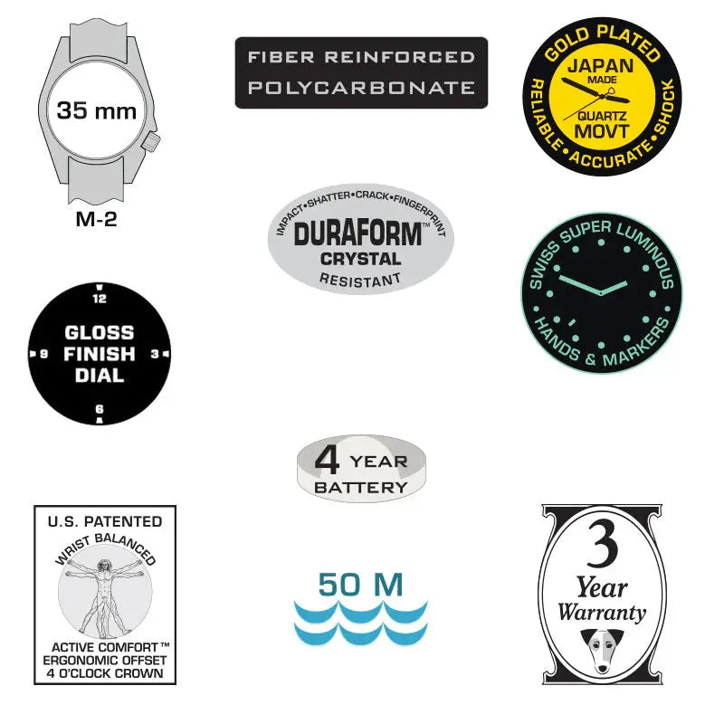 Experience unmatched comfort with the M-2RA Women's Field Watch, designed specifically with a super lightweight build and non-irritating Comfort-Webb™ band. Its rugged U.S. Patented case and band feature a domed crystal for easy reading, while Swiss luminous technology provides low light visibility. With a 4-year battery life, 50 M water resistance, and precision movement, this watch is perfect for any activity. Versatile, reliable, and always ready to go - it's the ultimate watch for the free-spirited woman!