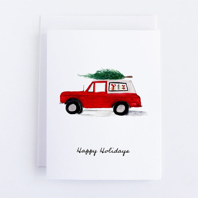 A sweet little red truck in watercolor, all ready for the holidays! Card says "Happy Holidays".