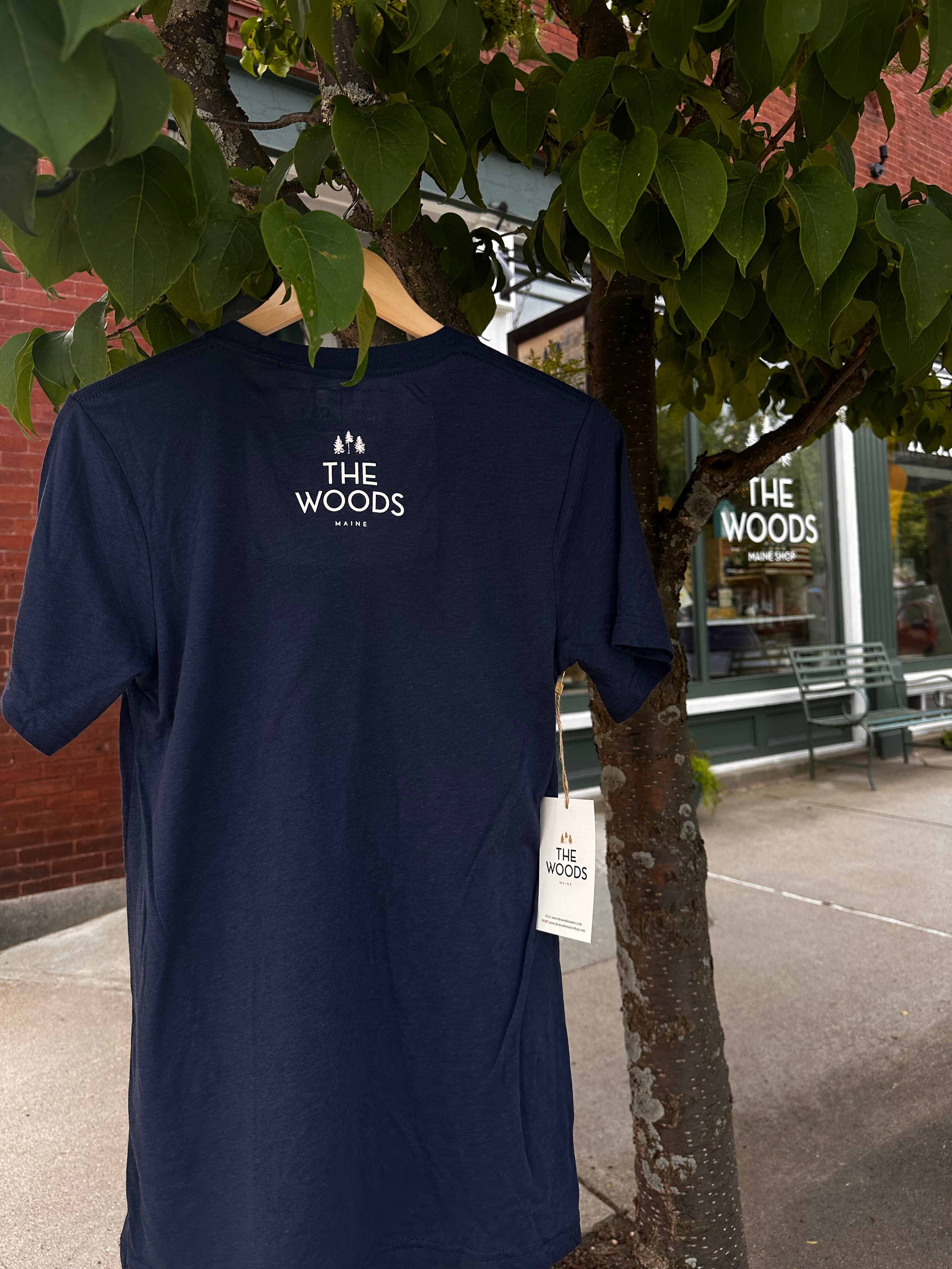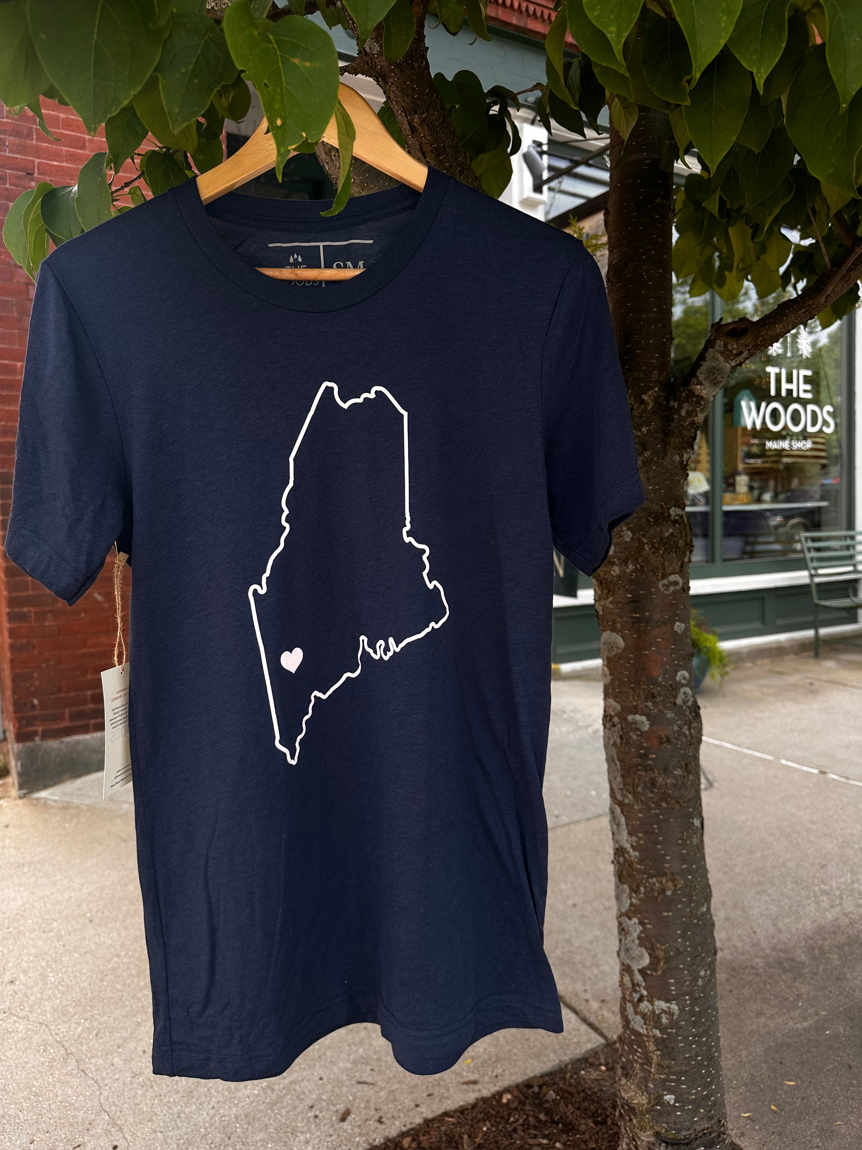 This classic navy tee features a clean and simple state of Maine outline on the front, marked with a heart over Norway, Maine, a subtle, stylish tribute to the town where our Maine roots run deep.