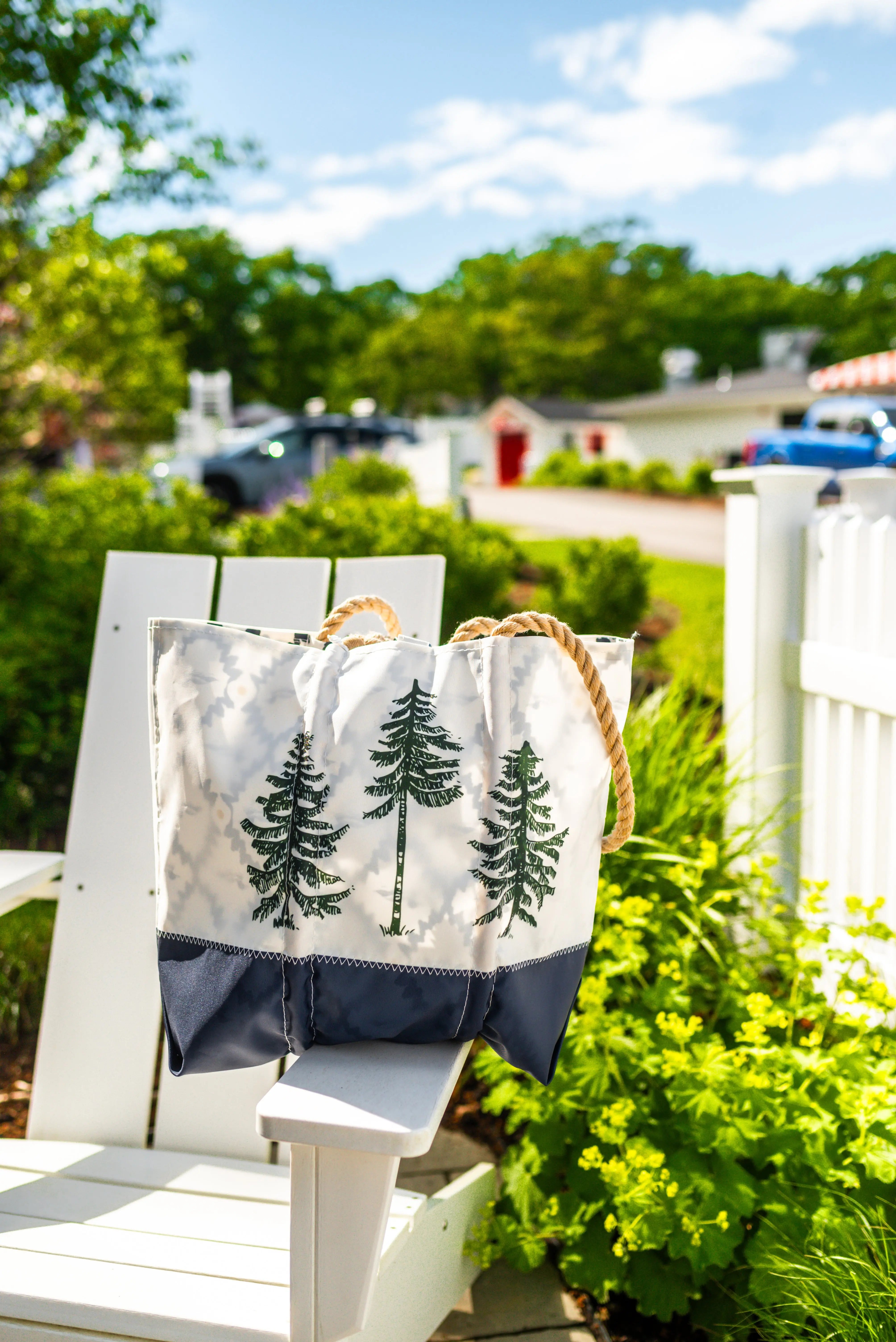 Our best selling Medium Tote features our signature Three Pines® brandmark on one side and a beautifully sketched Maine loon on the other. The unique, hand-sketched loon liner pattern was created exclusively for The Woods Maine® in collaboration with Kels Haley Textiles of Portland, ME.
