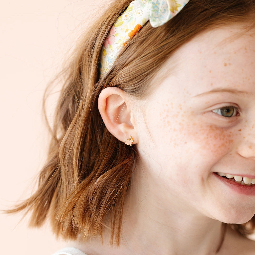 The Bunny Rabbit stud earring is Hypoallergenic 18k gold and enamel Bunny Rabbit earring with a flat screw back. Designed for babies, toddlers, kids, teens, and adults, these earrings offer fun style and comfort. They are waterproof, tarnish proof and perfect for sensitive ears.