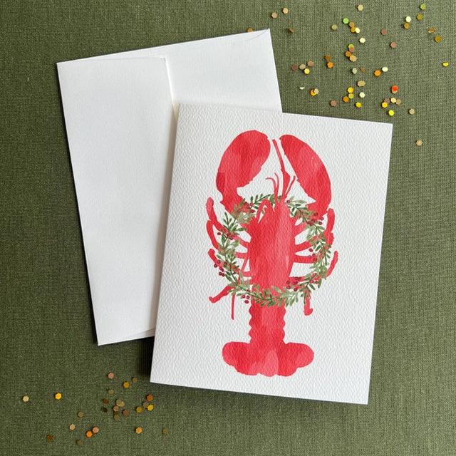 A set of six nautical holiday greeting cards featuring a lobster with a holiday wreath. The perfect card for a coastal Christmas! Created from an original painting.