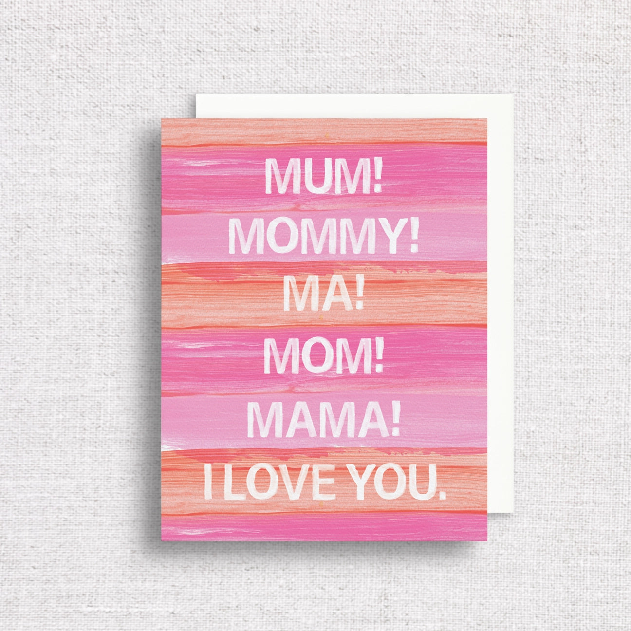 For the mom who answers to it all. This Mother’s Day card features painterly pink stripes with the playful phrase, “Mum! Mommy! Ma! Mom! Mama! I love you.” Fun, modern, and full of love, it’s the perfect card for Mother’s Day or any day you want to remind mom (or mum, or mama) just how much she means. Created from an original painting, it’s a sweet and colorful way to celebrate her—no matter what you call her.