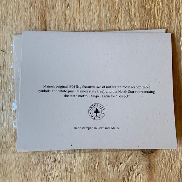 Inspired by the original Maine flag design, our Original Maine note cards are hand stamped right here in Portland, Maine starting with U.S.A made paper. Perfect for sending a note to family and friends near and far.