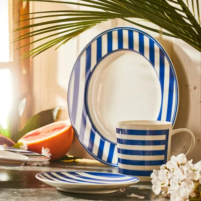 Perfect for casual entertaining, the blue and white geometric stripes remind us of a perfect beach day. The appetizer plates in creamy white premium porcelain layer effortlessly to add a clean, contemporary note and coastal flare to any setting.