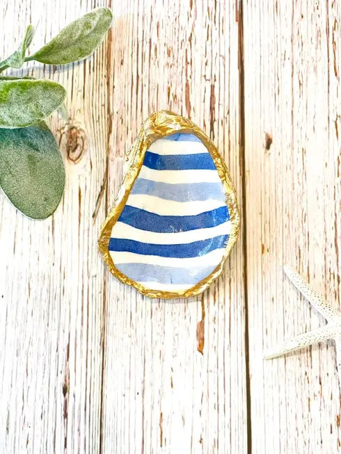 Each recycled oyster shell is hand painted, decoupaged, and finished with a painted gold leaf trim. The backs are left natural to maintain the oyster’s natural beauty.