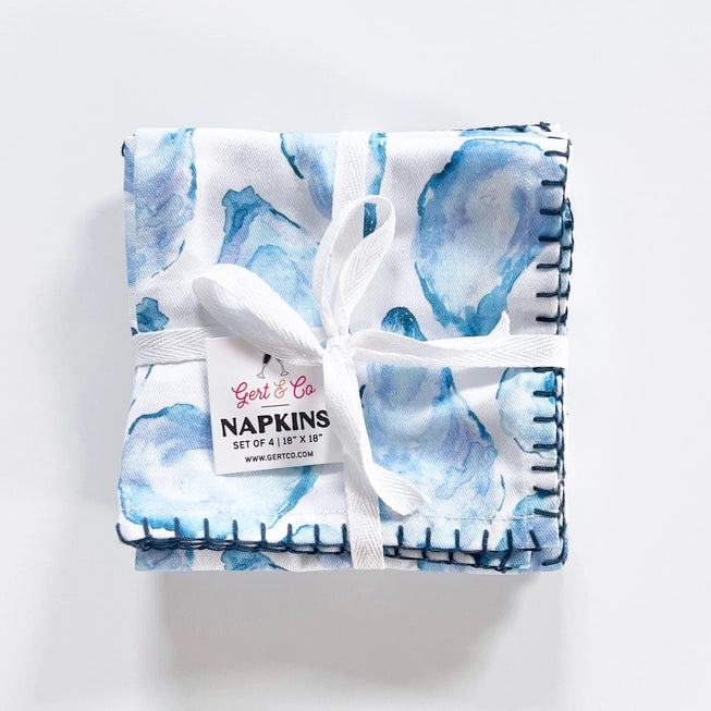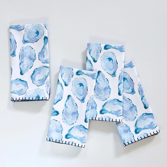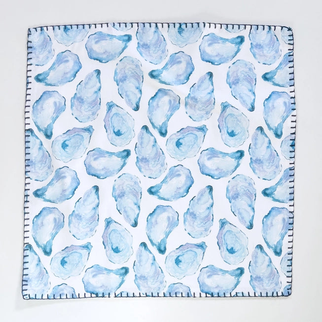 Create the perfect coastal table with these mussel shell fabric napkins. Crafted from 100% cotton, each napkin is 18" x 18" and features a navy whipstitch embroidered trim for an extra pop of fun. Created from an original watercolor painting.
