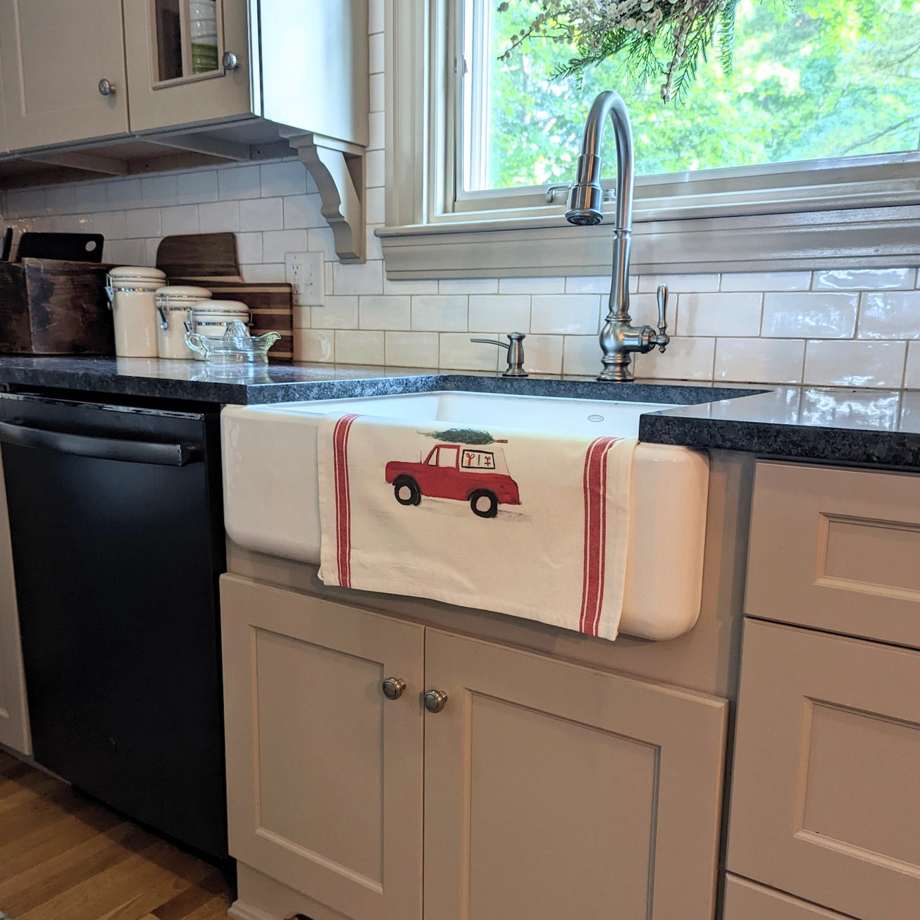 Pretty 100% cotton tea towel with vintage style red stripe and watercolor red truck. These kitchen towels also have a cotton hanging tab on the upper back corner for hanging and displaying designs. They get better with each washing! Lovely holiday or hostess gift!