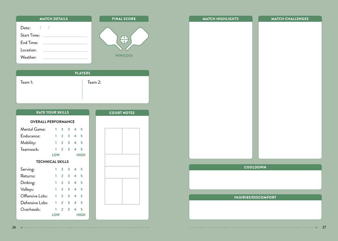 Whether you are working on your dink or fine tuning your lobs, Pickleball: Match Tracker is a logbook made for helping you become the best pickleball player you can be! This progress tracker and logbook allows you to keep notes on your games, recording your successes, goals, and areas you want to work on, along with scores and any other important info. Rate your skills after every game and get a holistic view of your mental game, endurance, teamwork, and more. This is a one-stop shop to chronicle the evolution of your pickleball game.