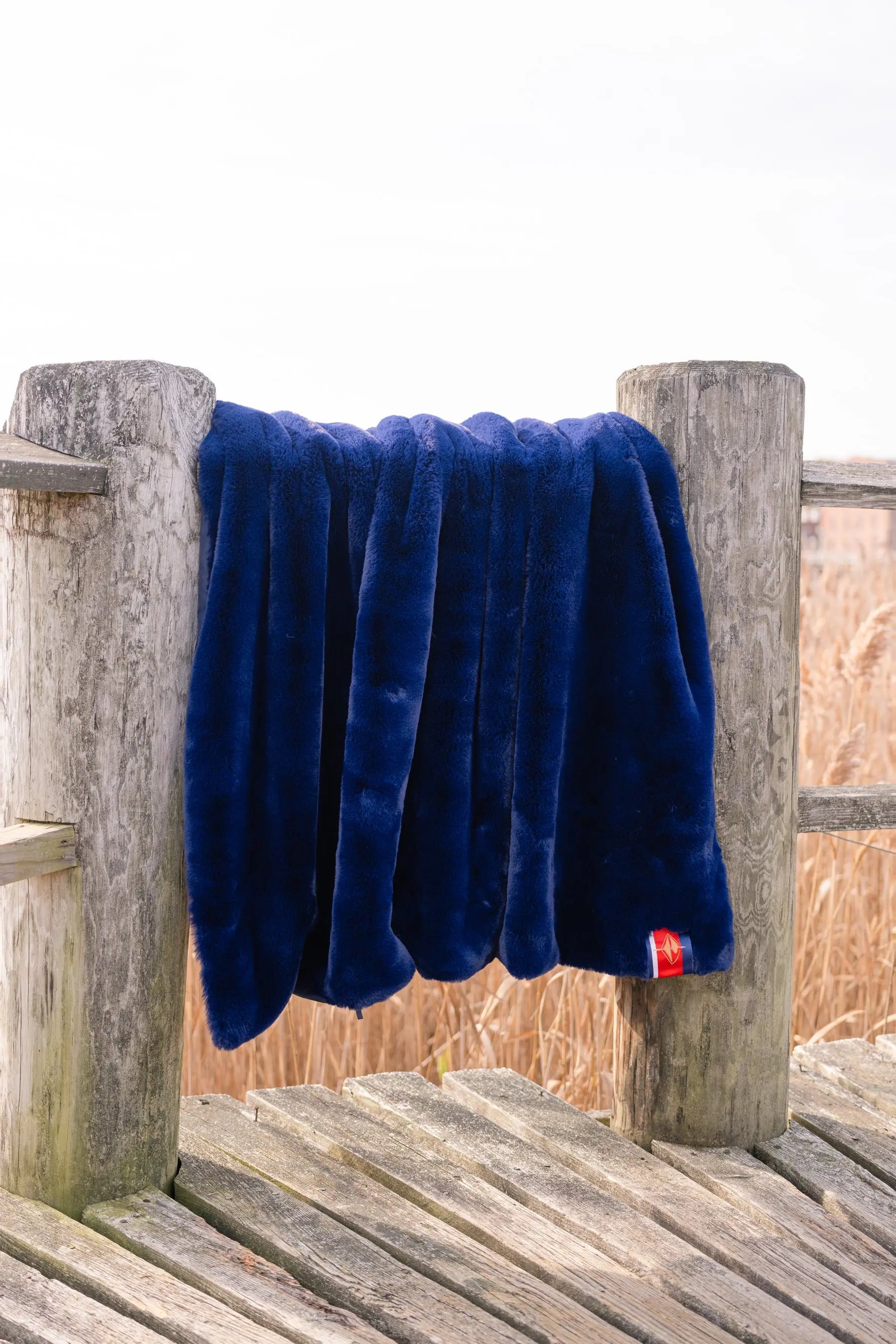 The Woods Maine® All Weather Faux Fur Original Blanket - White Faux Fur Original Blanket with Navy Backing is backordered and will ship as soon as it is back in stock.