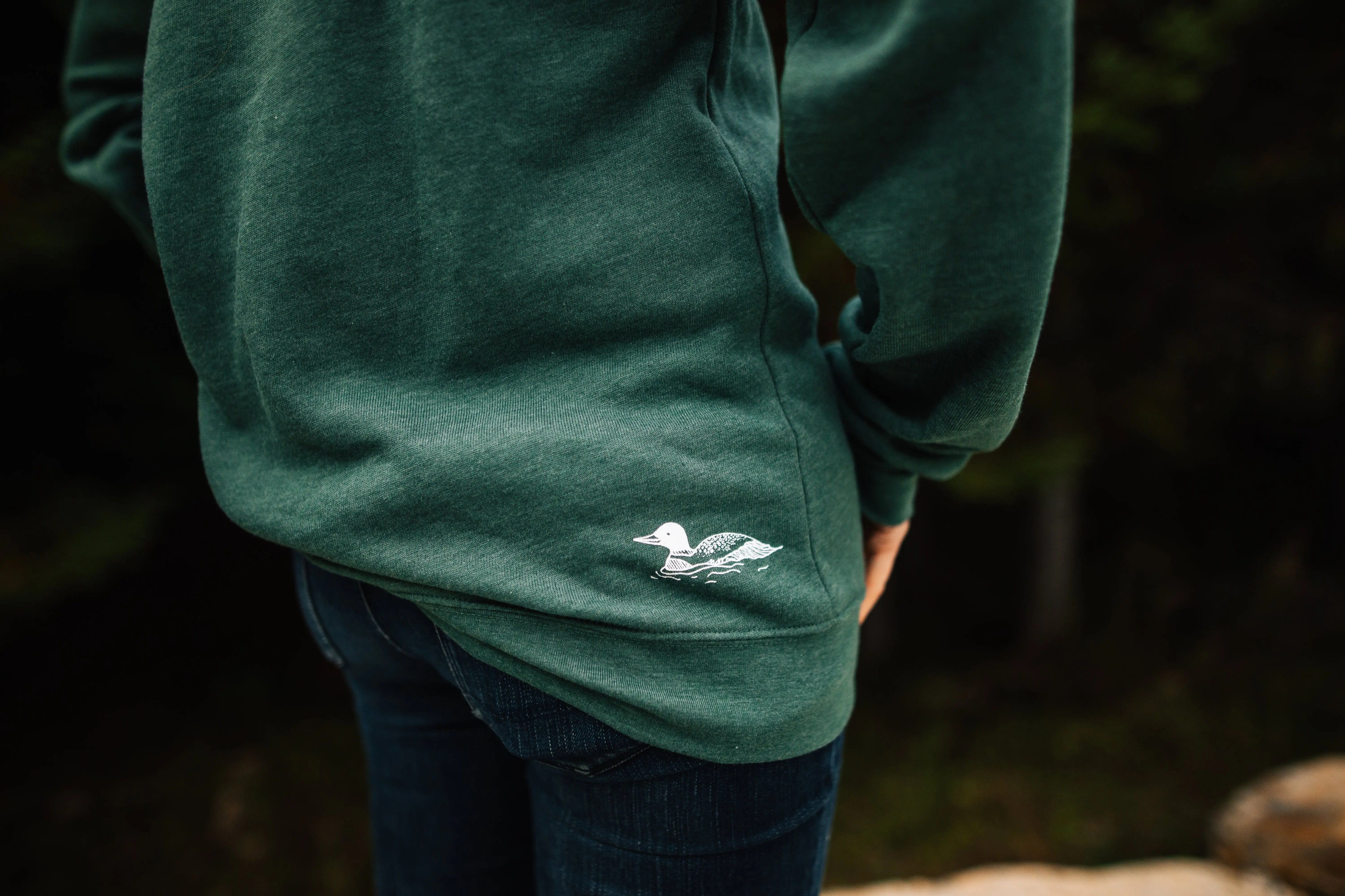 This new take on our signature style features the hand sketched Three Pines® brandmark on the front, The Woods Maine® mark on the back neckline and our beloved loon on the back hip.