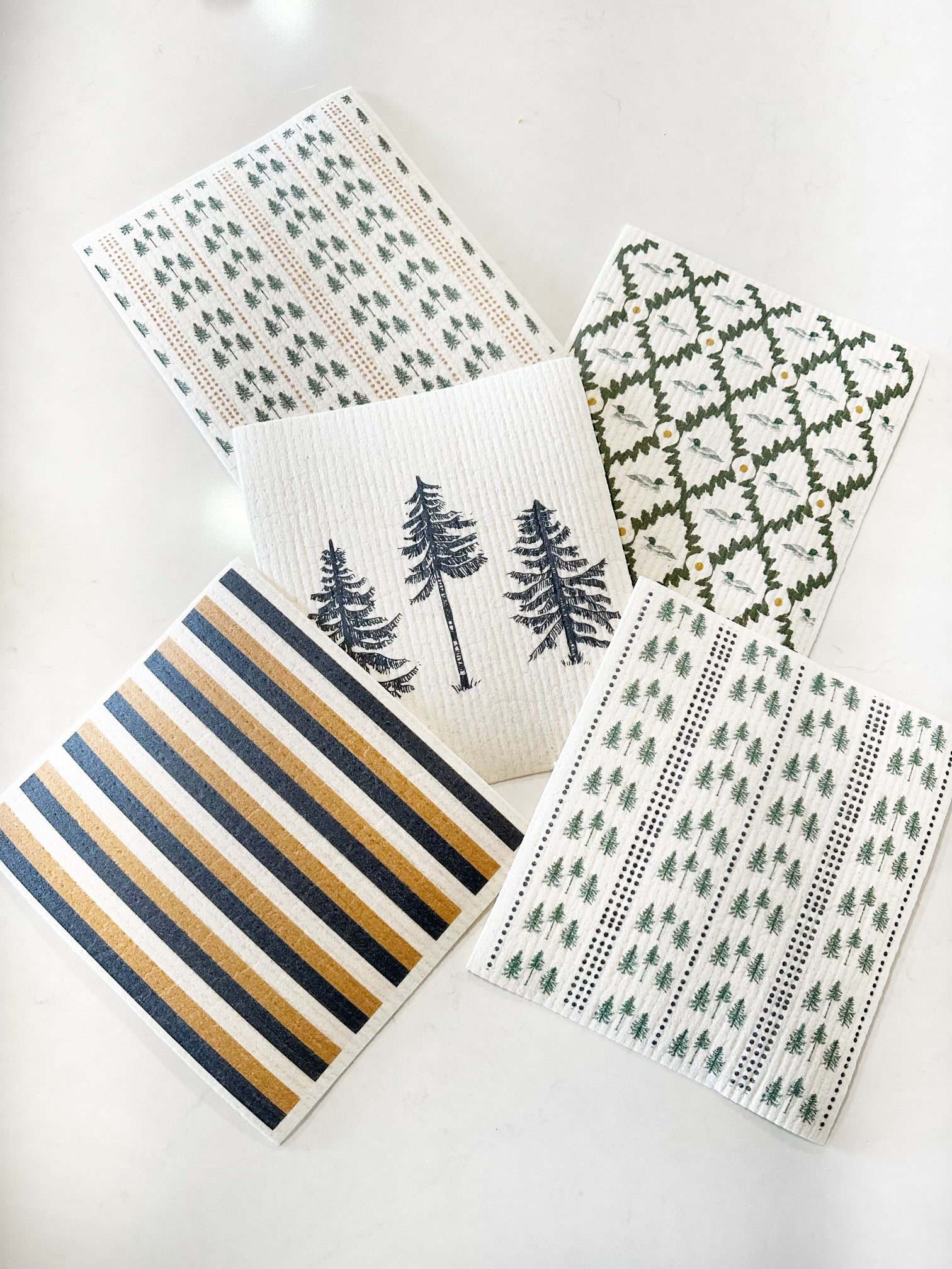 Meet the newest addition to the Treehome Collection by The Woods Maine:: Our wonderful Swedish super absorbent cloths far outperform regular cotton rags, paper towels and sponges because they are so light and absorbent. When moistened, they soak up any mess and leave a squeaky clean surface behind. Features our hand-sketched Three Pines® brandmark.