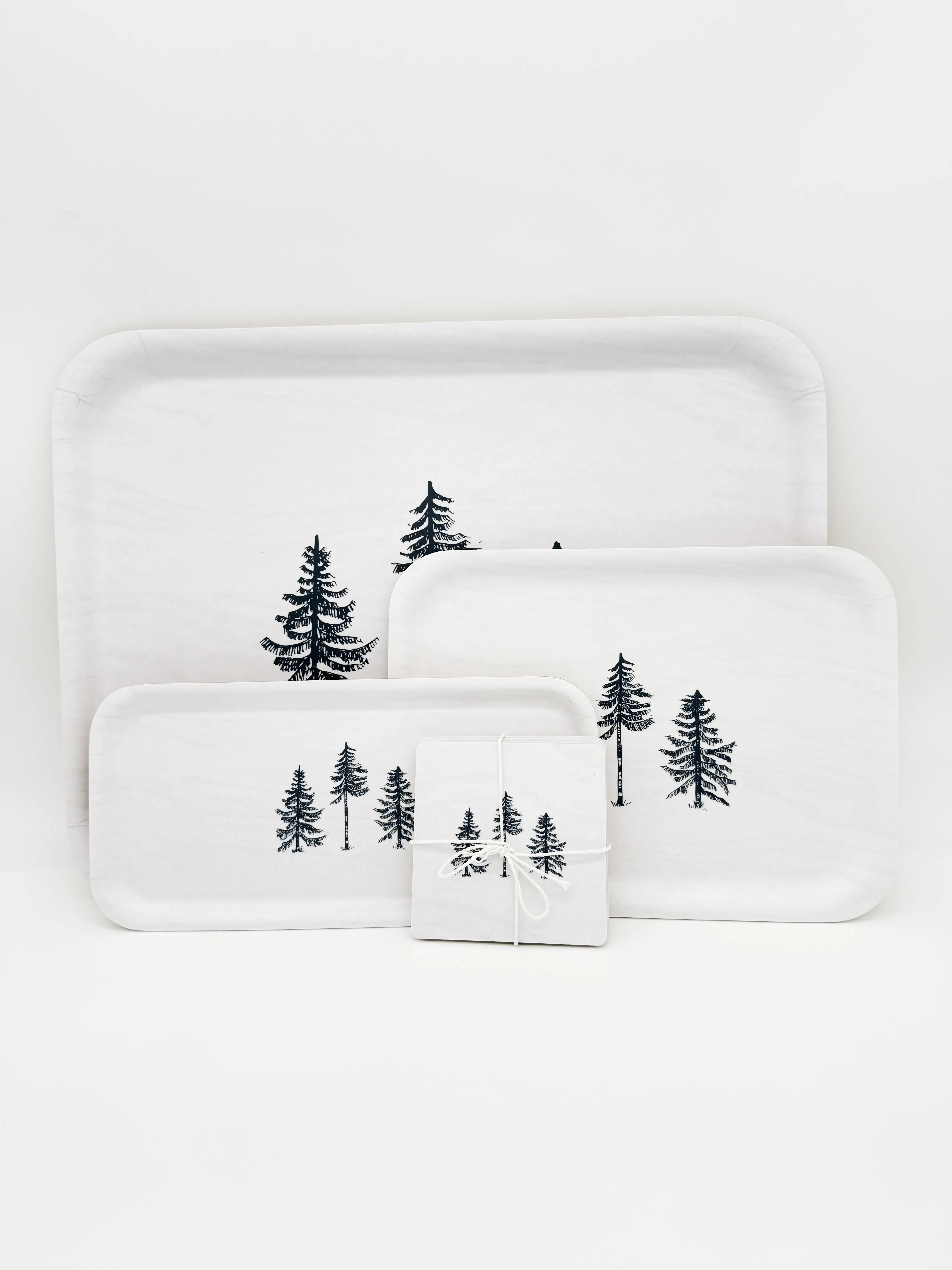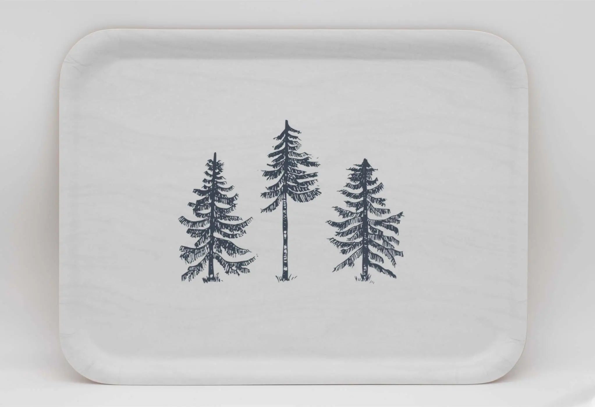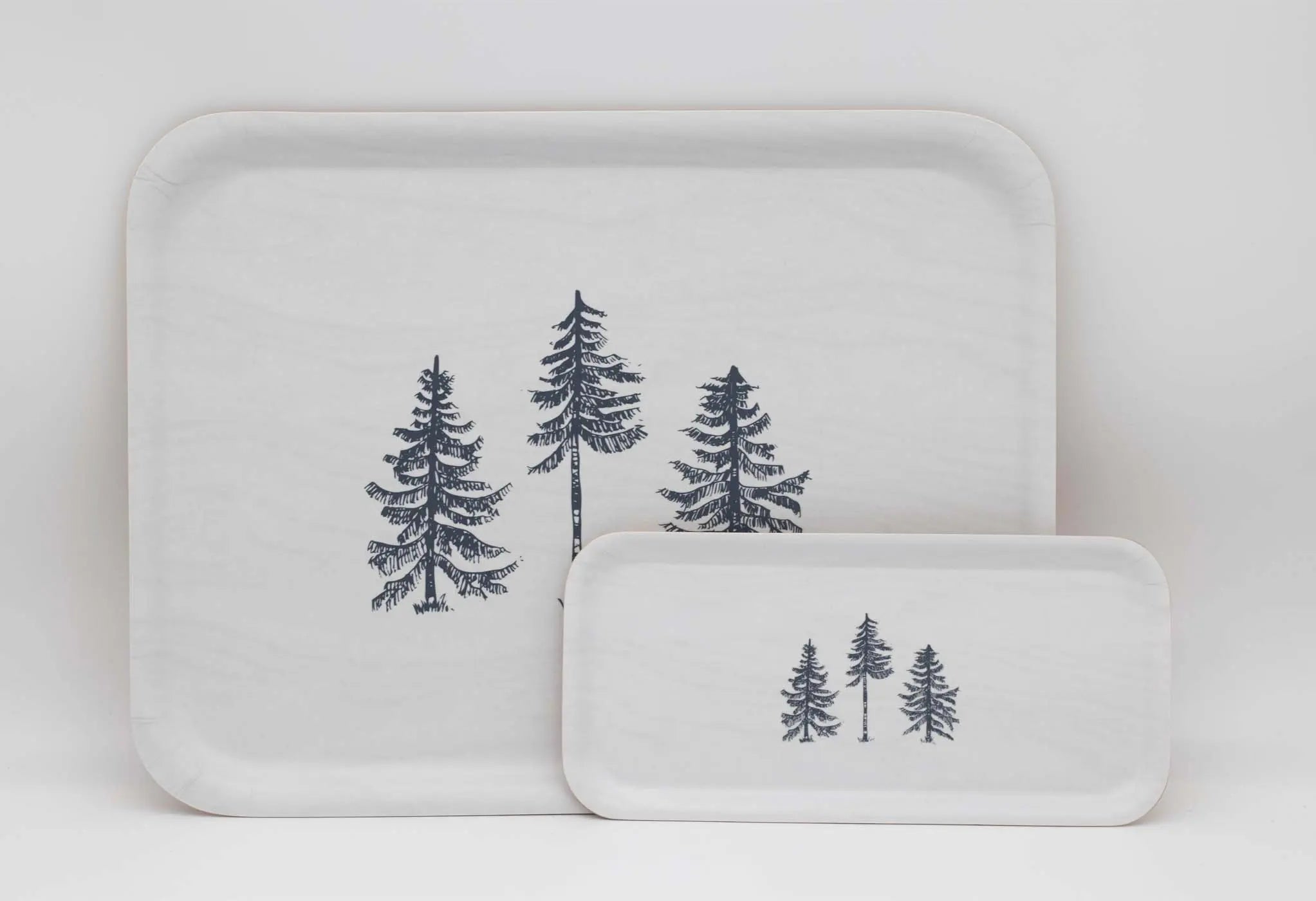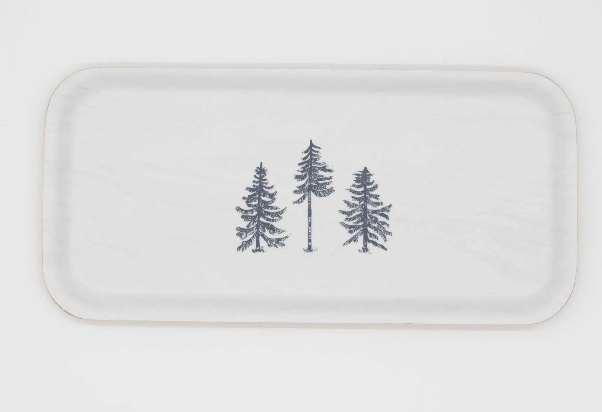 Choose from our Three Pines® in navy on a whitewashed finish, available in small, medium or large trays.