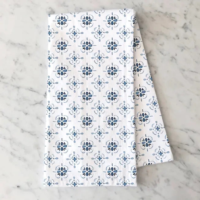 Update your kitchen with a classic blue and white tea towel. Reminiscent of a Spanish tile design, the medallion pattern on this dish towel will transport you to a seaside European city whenever you do the dishes! Created from an original watercolor painting.
