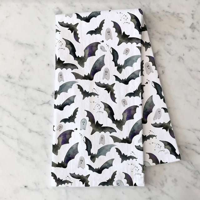 Black and White Halloween Bats & Ghosts Tea Towel Perfect for the kitchen or bar this fall season.