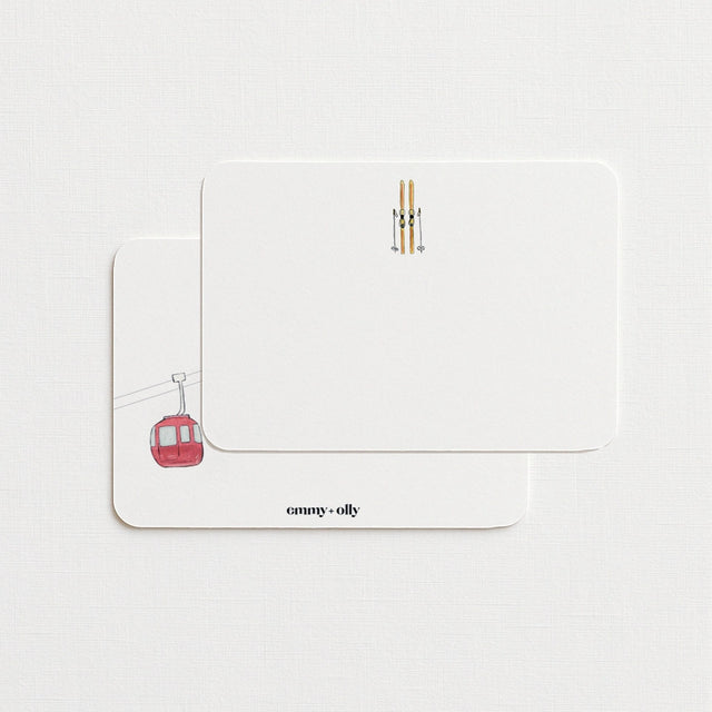 Add a mountain-chic touch to your stationery collection with this 10-set of flat note cards, each featuring an original watercolor design of a pair of skis at the top center and a charming gondola scene on the back.