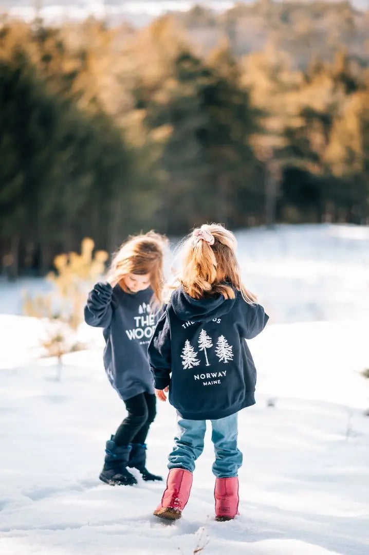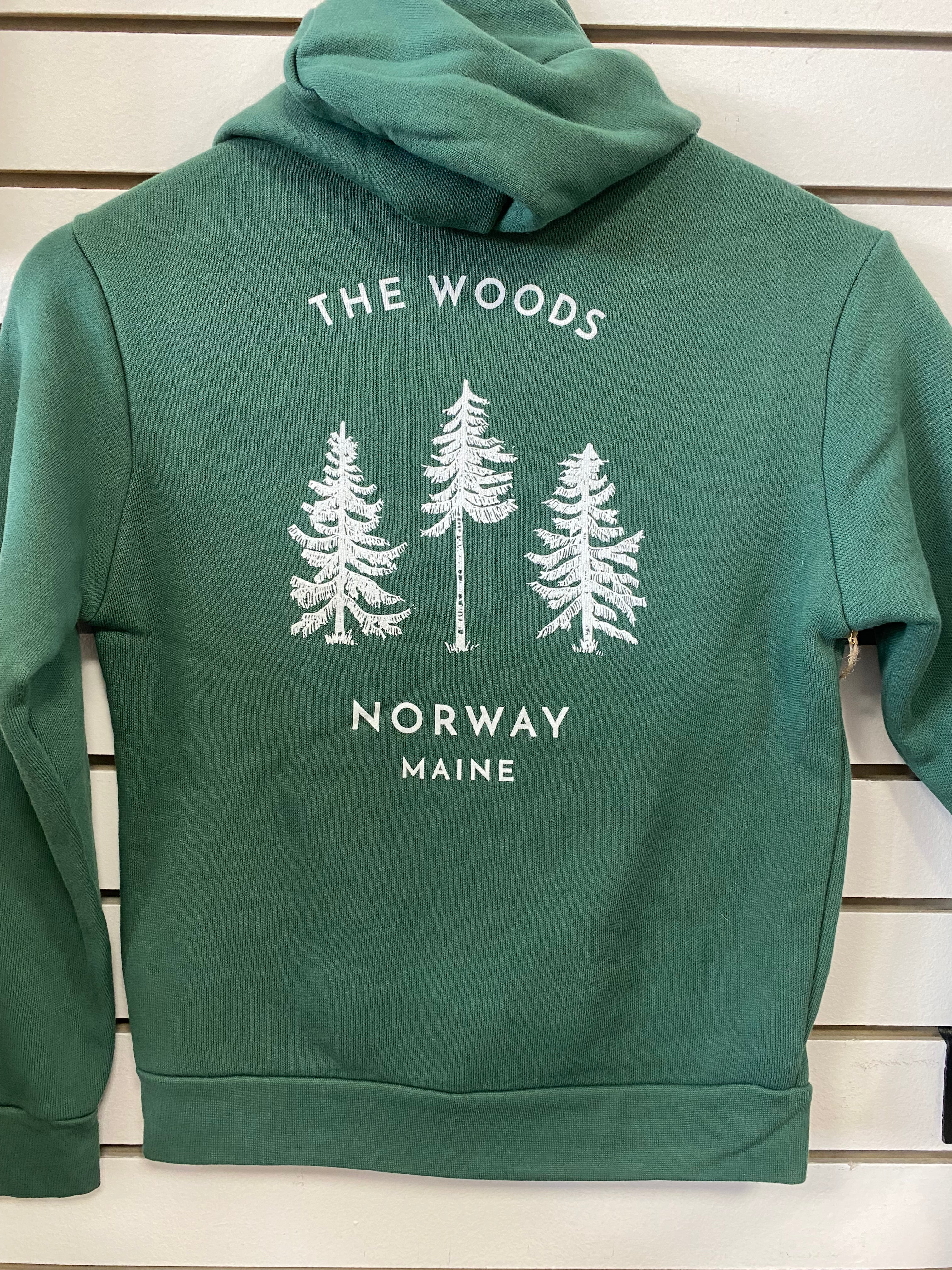 Cozy, comfortable and so durable. This hoodie is ready-made for your youngster and features The Woods Maine® Three Pines® brandmark on the front and our signature “Norway” design in back, celebrating our beloved town of Norway, Maine.