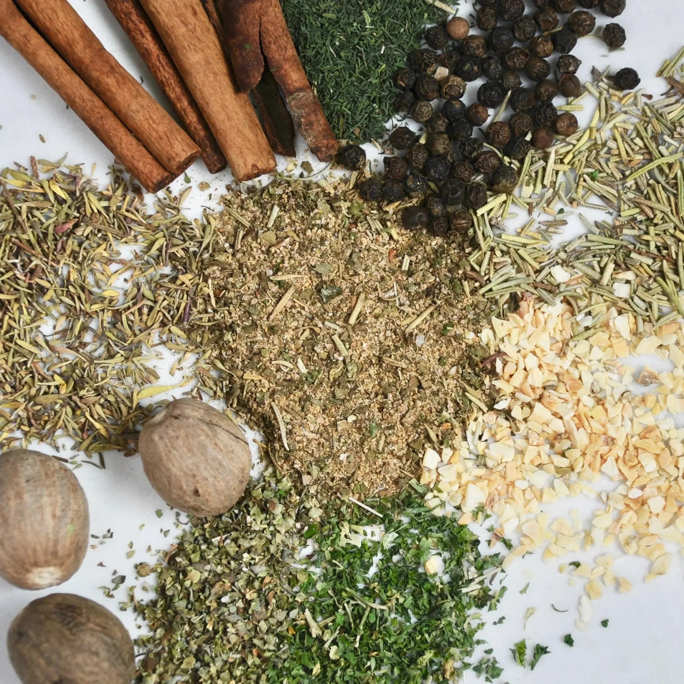 Ingredients: Salt, Garlic, Black Pepper, Basil, Greek Oregano, Rosemary, Cinnamon, Nutmeg, Thyme, Dill, Marjoram, Parsley