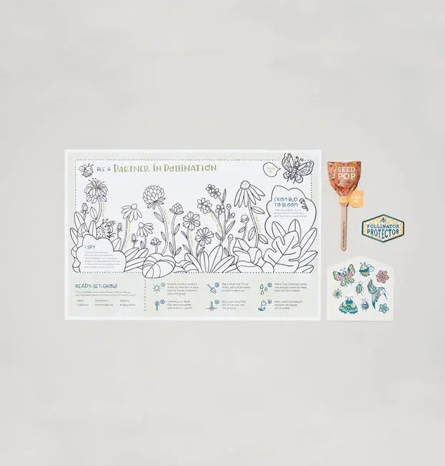 Pollinator Protector Activity Kit features a Wildflower Seed Pop that grows a small pollinator-friendly garden. As the garden grows, the included Activity Mat encourages kids to color in the flowers they see, and a Sticker Sheet enables them to add visiting pollinators to the Mat. A Pollinator Protector Merit Badge recognizes the work done to better the planet.