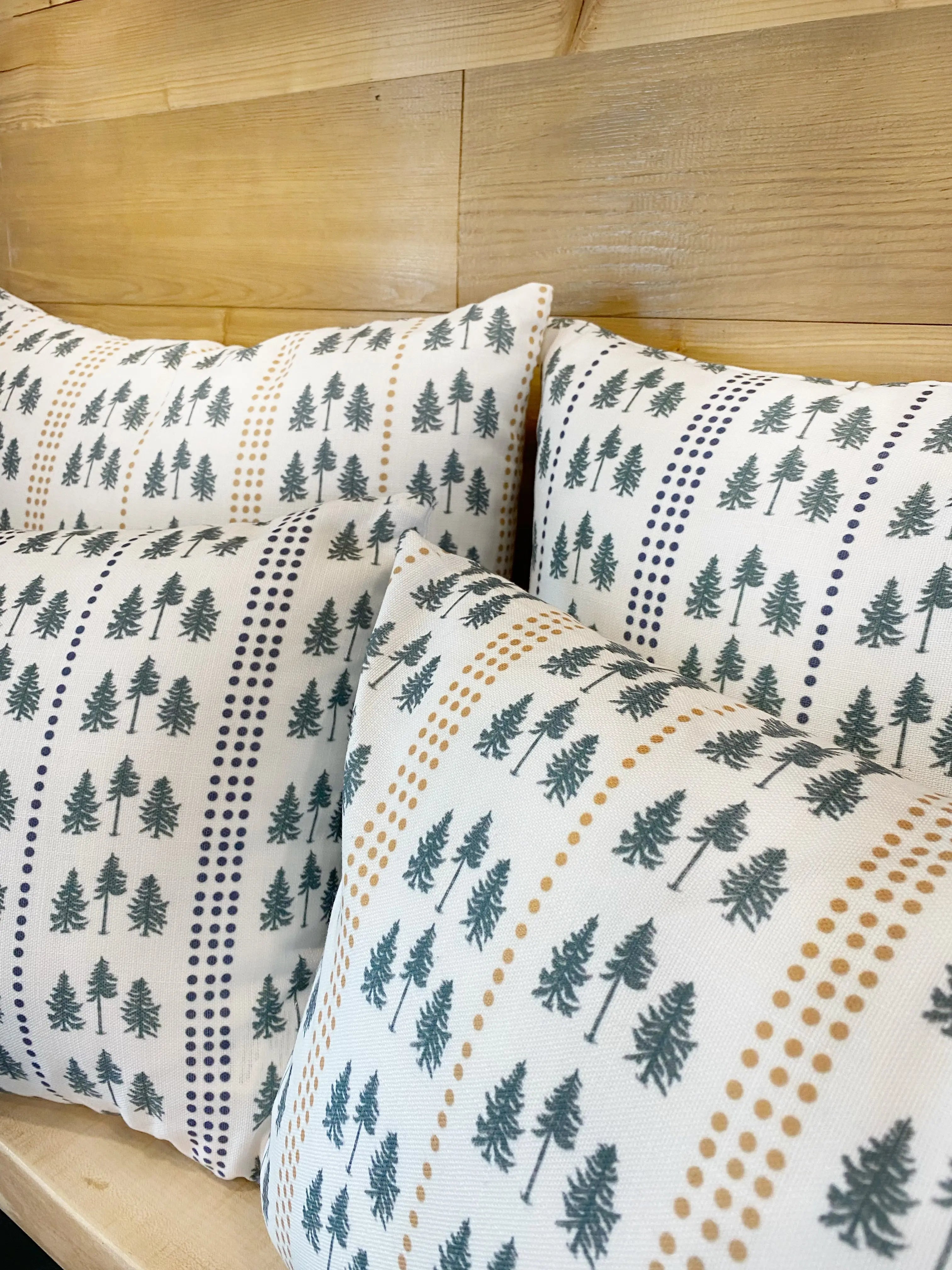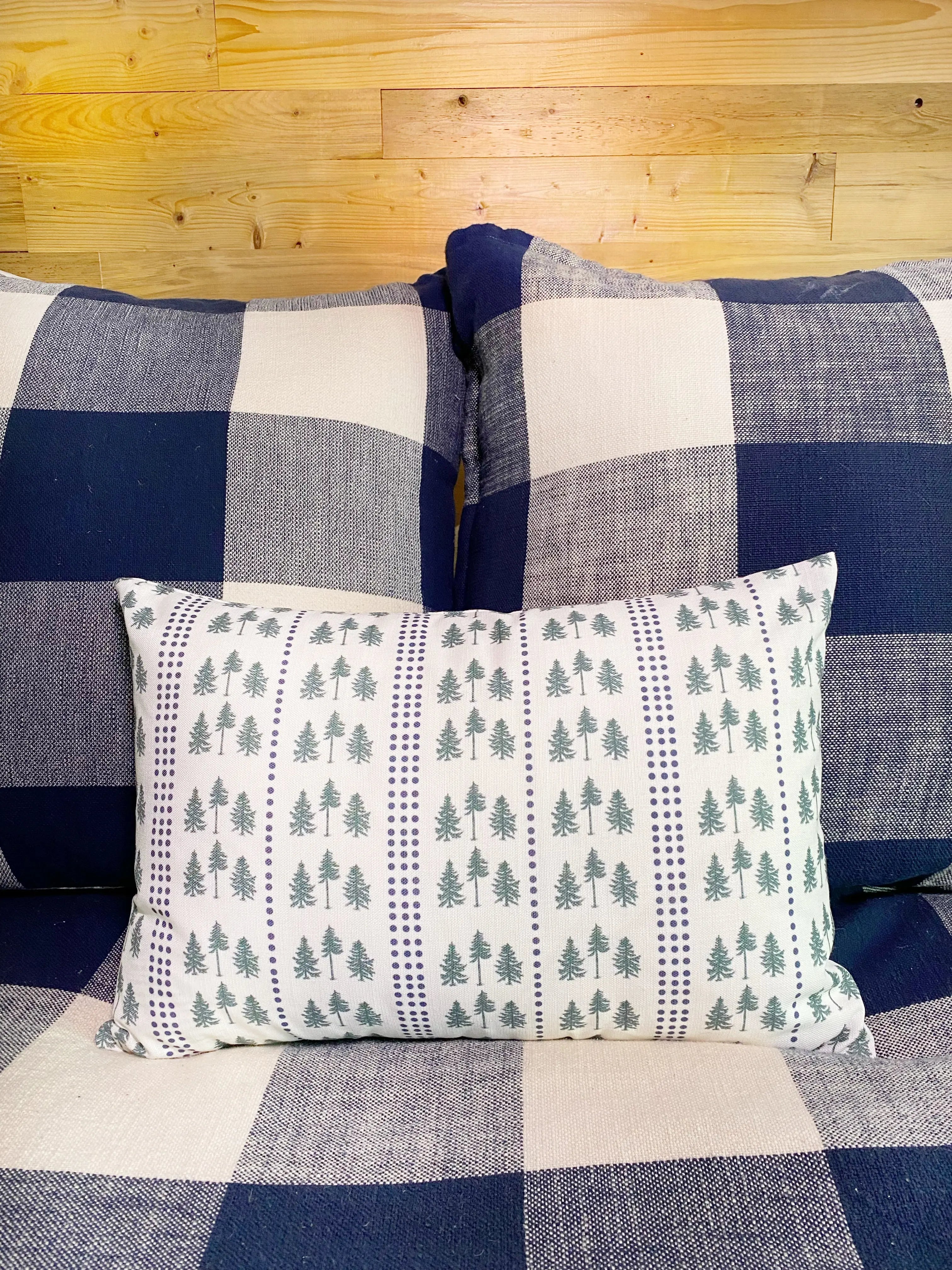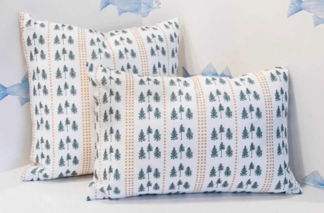 Available in gold and navy, 14x20 lumbar and 18x18 sizes, the Three Pines® pillows are perfect on their own and also pair perfectly with The Loon pillows—our original collaboration with Kels Haley Textiles.