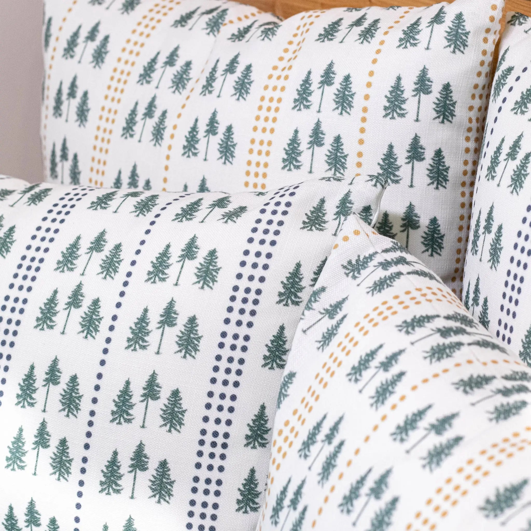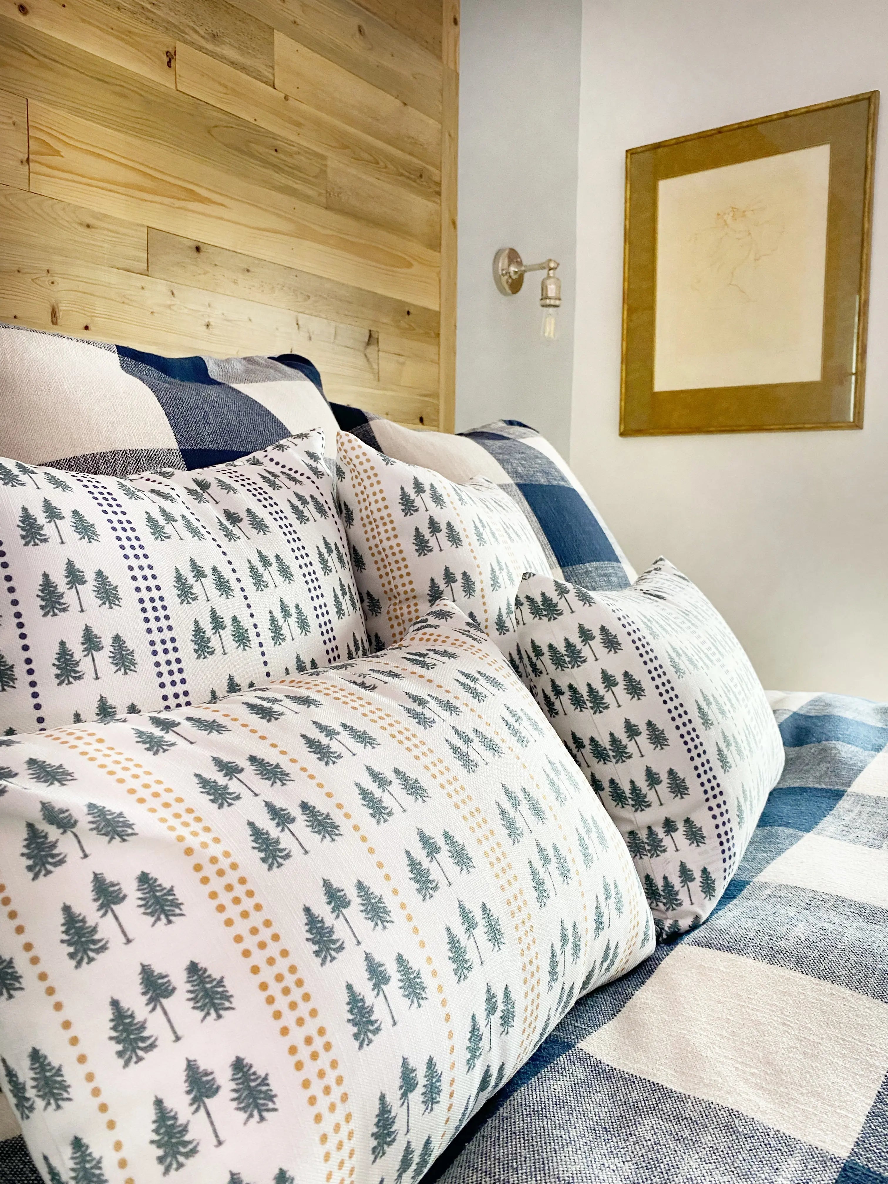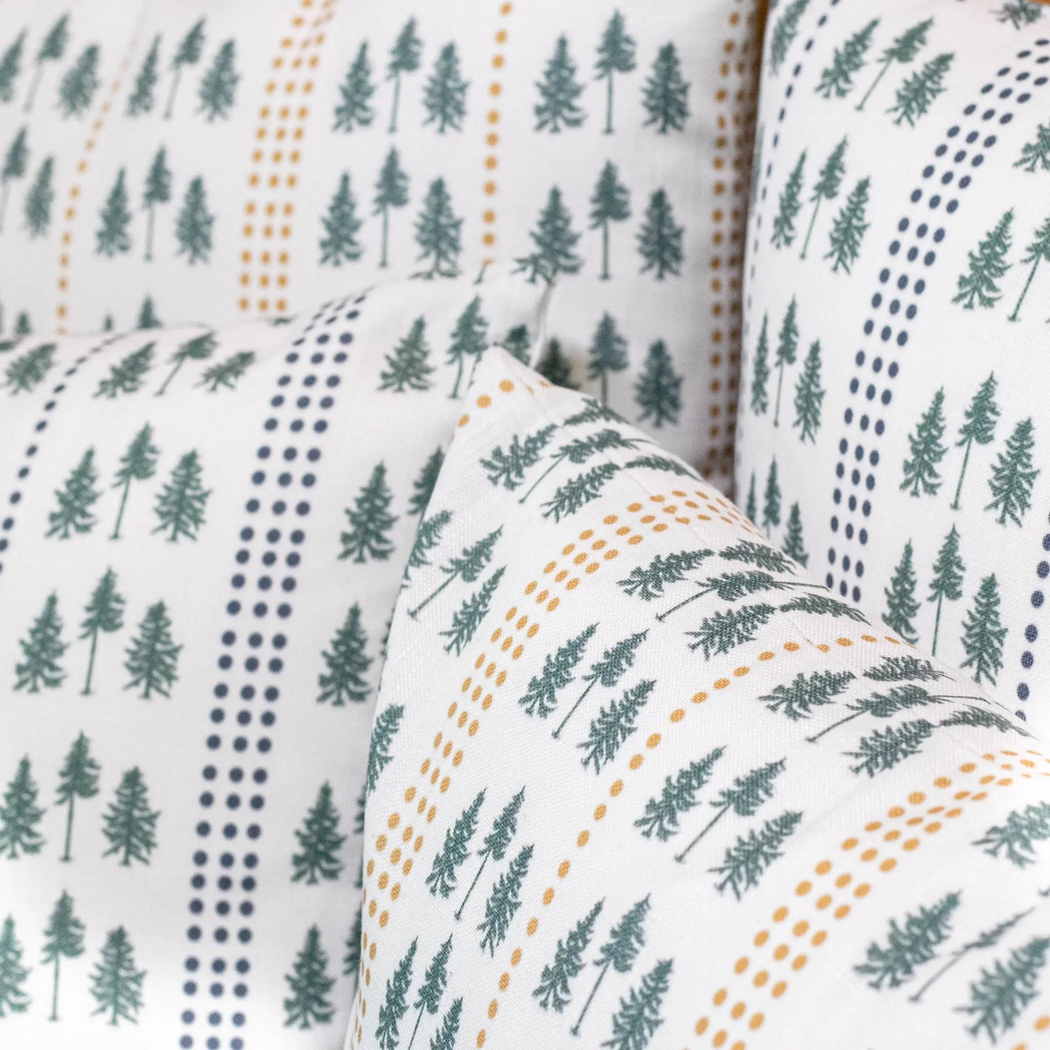 Available in gold and navy, 14x20 lumbar and 18x18 sizes, the Three Pines® pillows are perfect on their own and also pair perfectly with The Loon pillows—our original collaboration with Kels Haley Textiles.